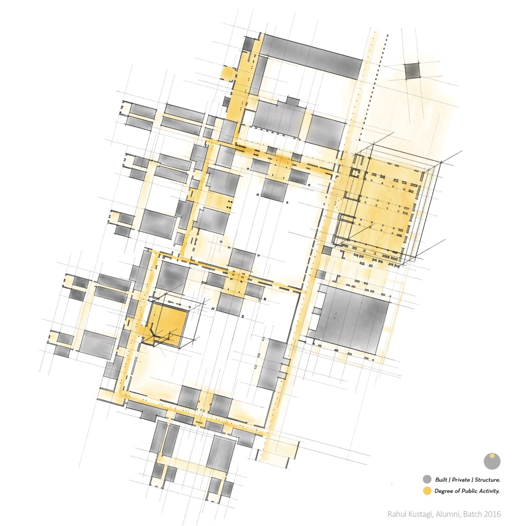 Nolli’s Map is a two-dimensional plan used to understand and document the accessibility and flow of public space within a city. It is a figure-ground drawing, simply put, it shows contrast in relationships between positive and negative spaces, solids and voids, shadows and light. What happens when a technique that had been applied at an urban scale, is being applied at an Institutional scale? Does this reveal any character of the institution? In an educational institution, where can one meet, greet, fight, play, hide and what not?
