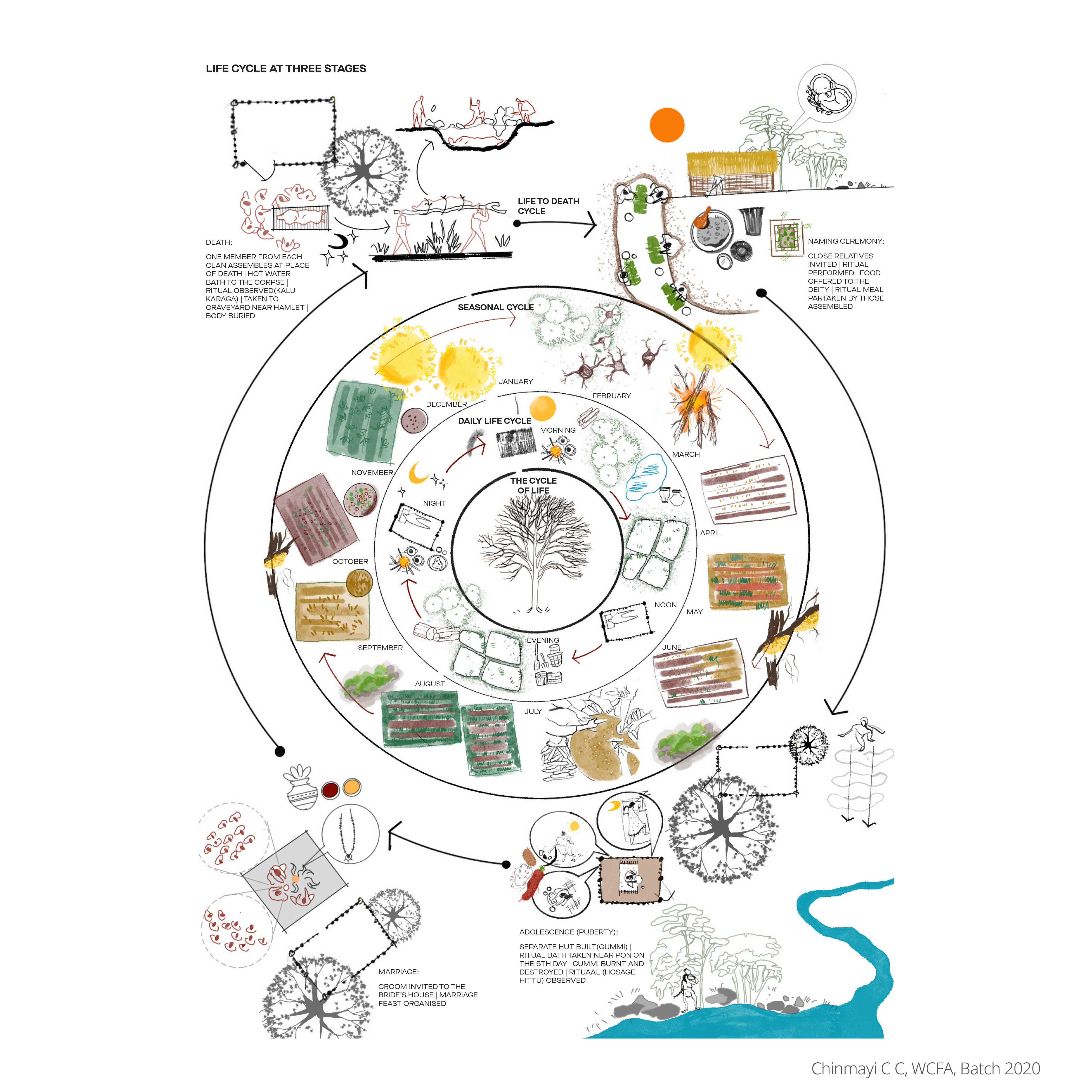 The Soliga life cycle drawing was made as part of my thesis, “Rooted Roofs, enabling a semblance of a free past”. It aimed at documenting and representing the ritualistic aspects and cyclical nature of the Soliga lifestyle at three scales- the daily life, the agricultural cycle and the life cycle. This also helped understand their rootedness with nature, offering insights into their way of living.