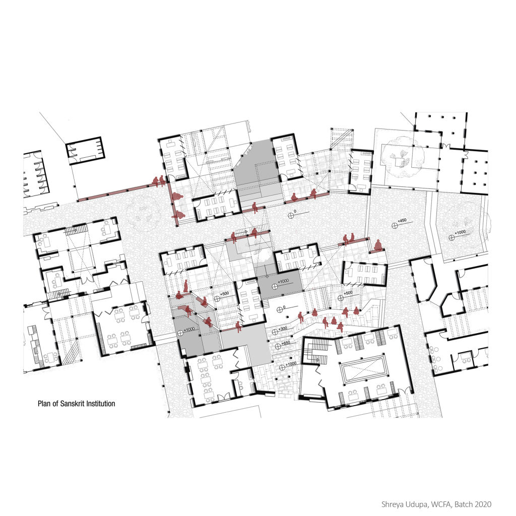 This is a ground floor plan of the institution block, drawn at 1:100. The idea was to focus on the formal spaces like classrooms and the informal spaces like courtyards of different purposes happening between them. In order to achieve that, the humans are placed in elevation in those informal jagali katte.