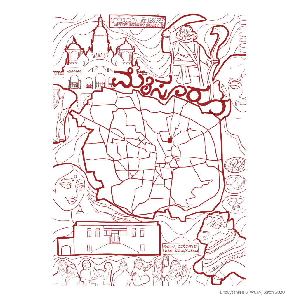 This illustration, created using Procreate, captures the essence of Mysuru. It’s a glimpse into the soul of the city, blending its royal past with its lively present.