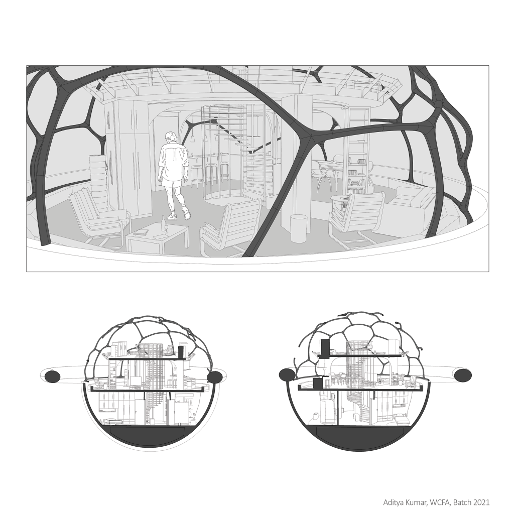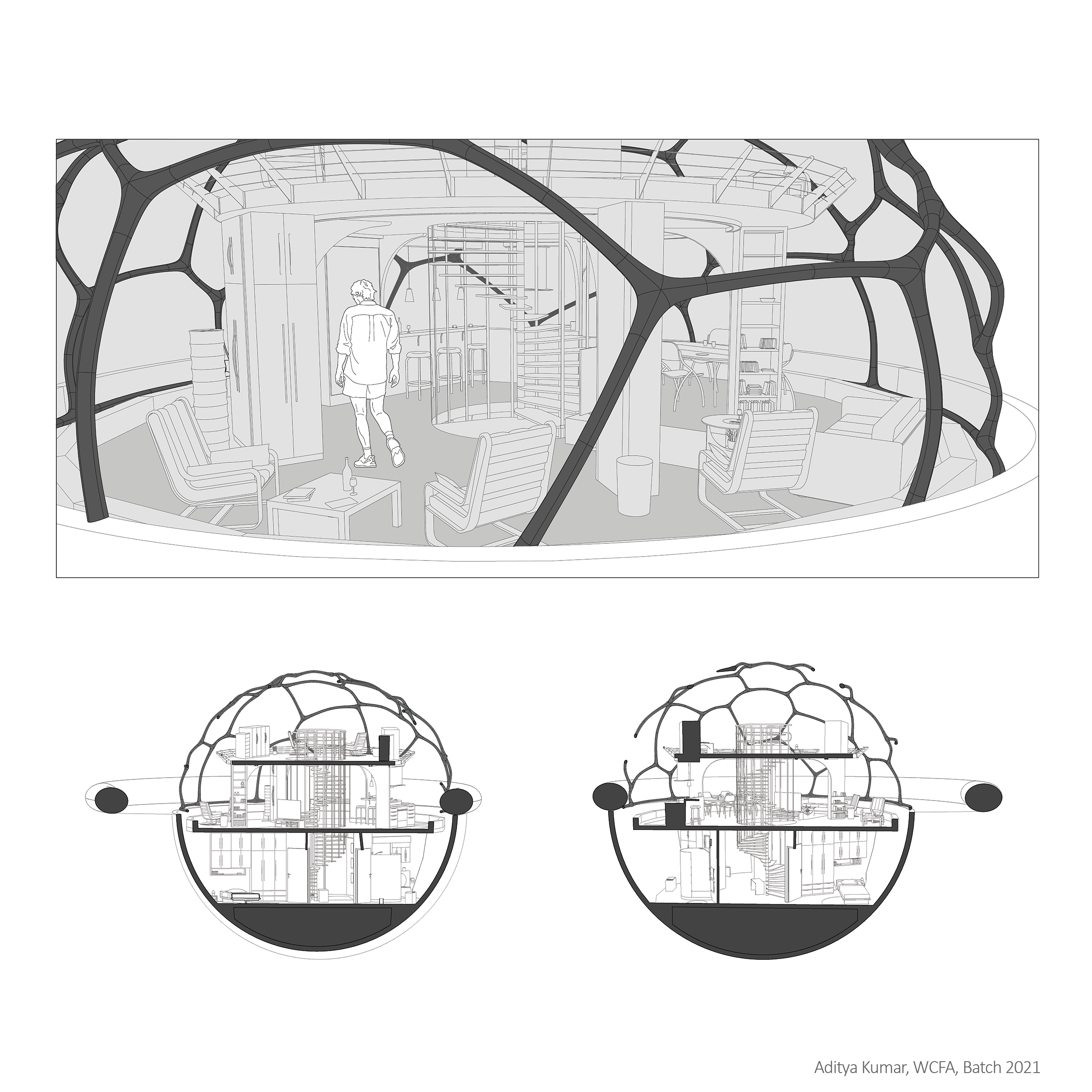 The Domical Tiny House is a three-story, multifunctional dwelling designed for versatility across various terrains, including submerged, forested, and mountainous environments. Its structure integrates a solid lower half for durability and privacy, while the upper half features a transparent lattice dome, optimizing natural light and panoramic views.