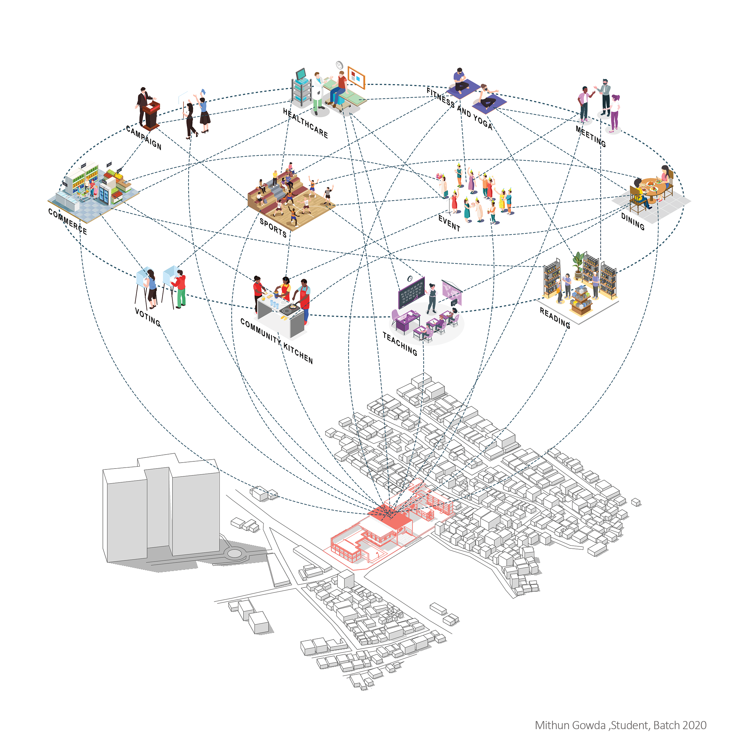 This diagram reimagines the school as a vibrant, multifunctional hub that plays a crucial role in the social, cultural, and economic life of the neighborhood. It illustrates how the school extends beyond its traditional educational function to host a wide range of community-driven activities like healthcare services, sports, cultural events, commerce, and public gatherings. By acting as a shared space for learning, collaboration, and interaction, the school fosters inclusivity and strengthens community engagement. This interconnected network enhances access to essential services, promotes collective growth, and transforms the school into a central platform for public life.