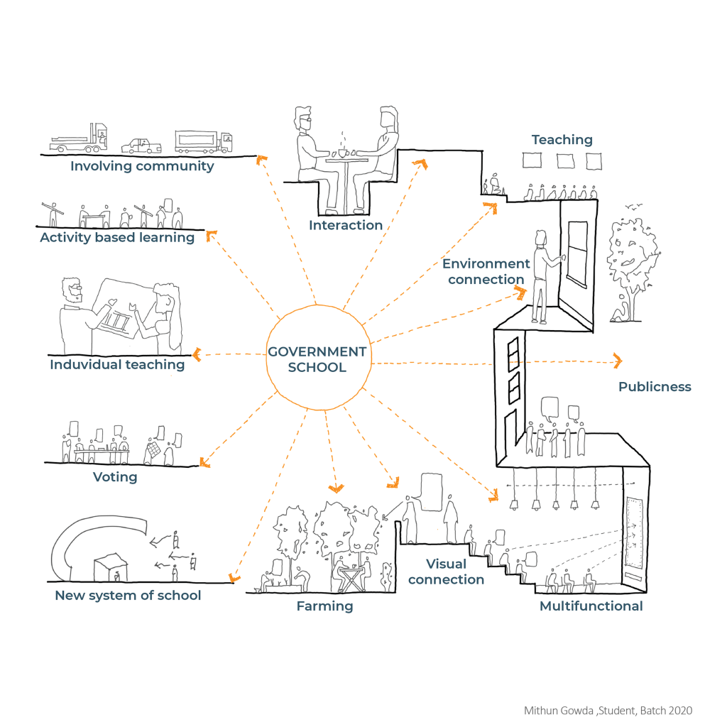 This illustration envisions a government school as a dynamic and inclusive space that goes beyond its conventional role in education. It highlights the school’s potential to foster a deeper connection between students, teachers, and the broader community through diverse activities and shared experiences. By creating adaptable environments and encouraging participatory practices, the school becomes a platform for collaboration, creativity, and growth. The diagram suggests that such a space can shape a more engaged and interactive society, where learning extends beyond classrooms and contributes to the development of a more connected and responsive community.