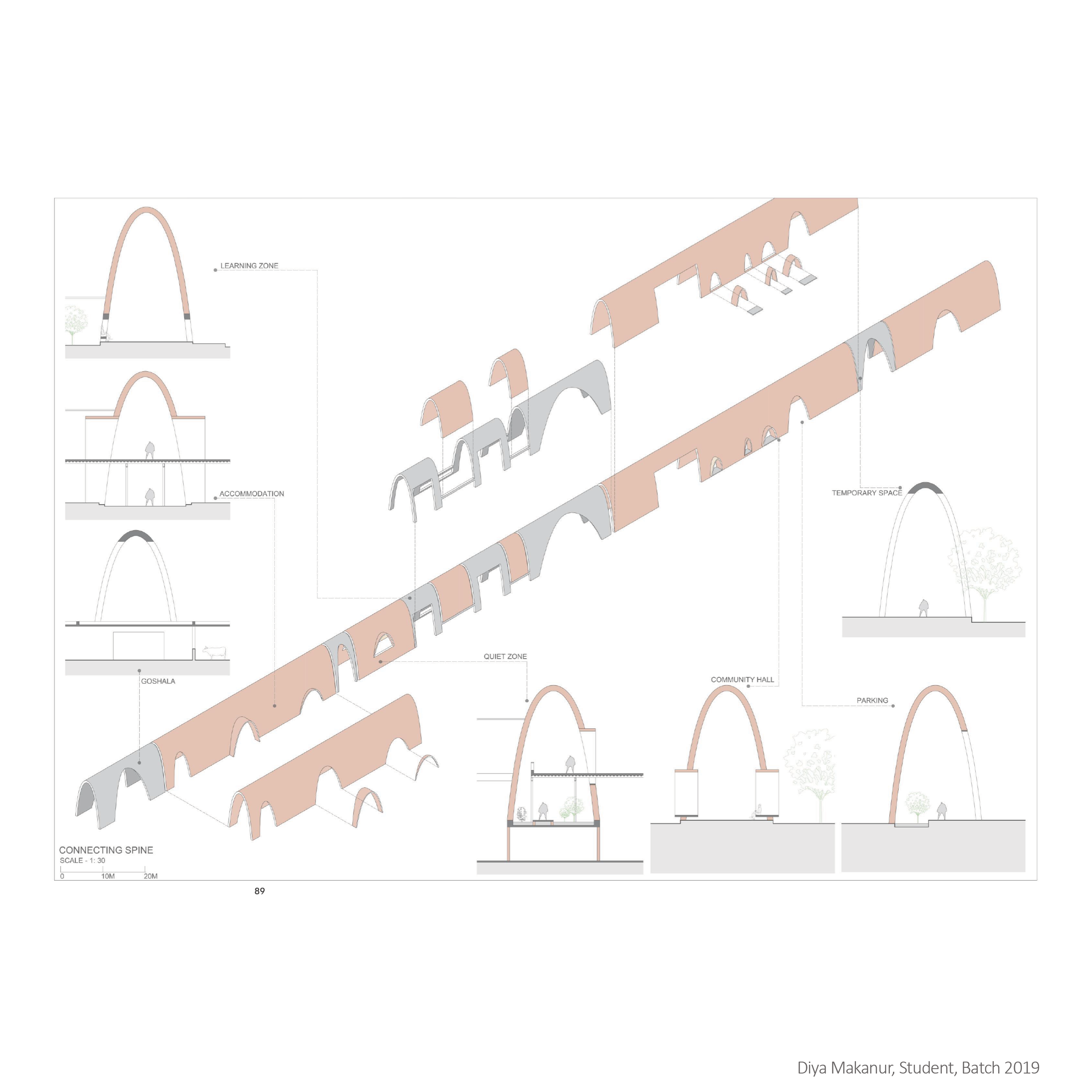 The isometric drawing reflects the project’s exploration of spatial moods and adaptability. It emphasizes how the vault responds to various programs, illustrating its role in shaping spaces like accommodations, goshala, and public areas. Openings are carefully detailed to suit privacy, ventilation, and connectivity, aligning with each space’s character.Part sections provide a focused view of these conditions, showing how the vault integrates seating, controls enclosure, and adapts to functional needs. This method allows the drawing to narrate the project’s core ideas, combining mood, spatial experience, and technical clarity in a cohesive visual language.