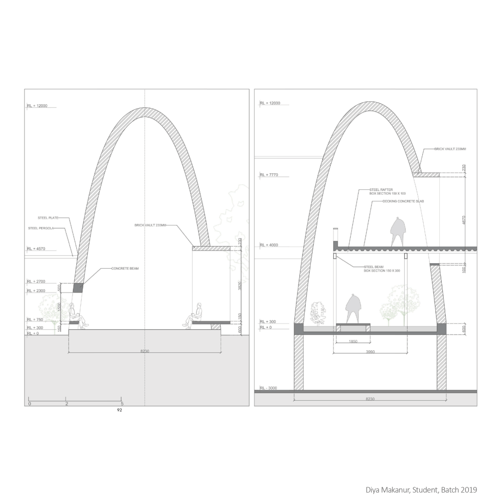 The detailed part sections explain the materiality, volume, and scale of the spaces, emphasizing technical aspects. The second section illustrates the spine’s interaction with adjacent areas and the integration of varying levels within the vault. It demonstrates how vegetation seamlessly becomes part of the spine, enhancing the spatial experience.