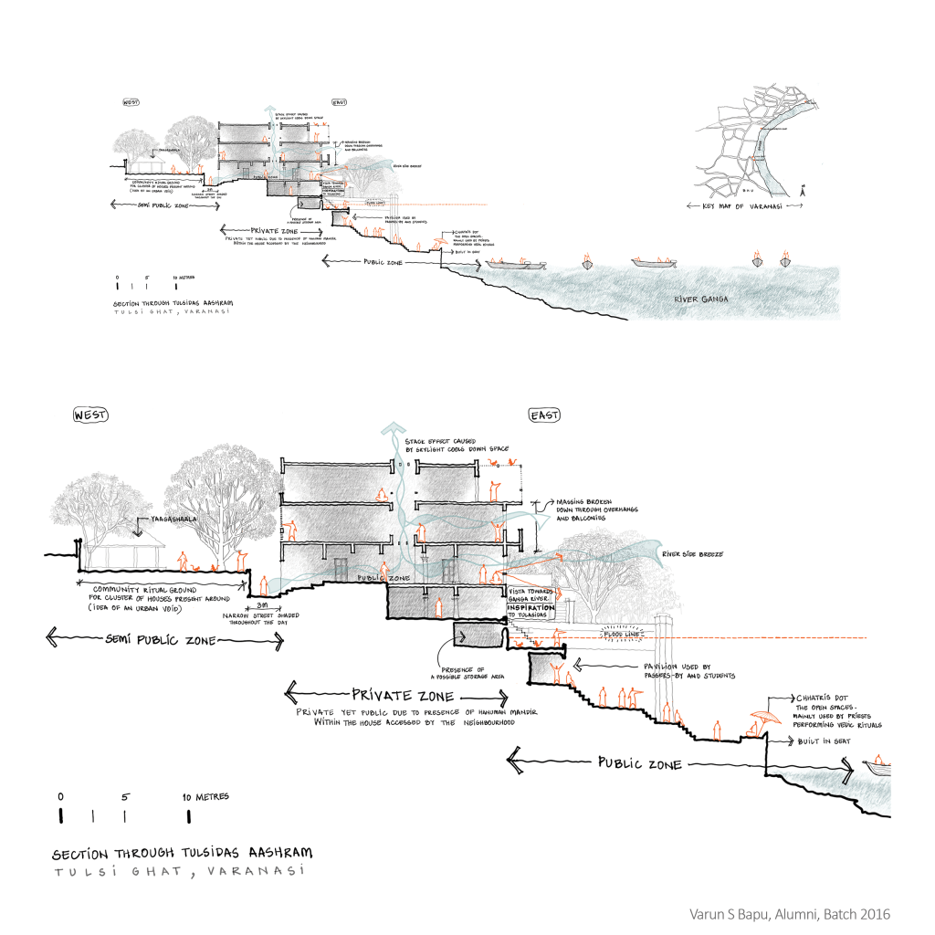 Travel sketching serves as a valuable tool for observation, and has allowed to capture the essence of significant architectural sites across India. This sketch is a digitised version showing the section of Tulsi Ghat in Varanasi, India giving insights into the spaces, landscapes, and design principles of the residence of the saint.