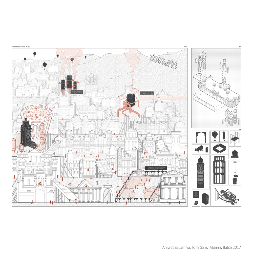 The following drawing is an imagined dystopia of Mysore, a city caught between the past and the future. It is a city of facades, its citizens living their lives within a masquerade, erecting new imitations of its old identity in an effort to keep up the image of grandeur disseminated by the royal family. The palace – the city’s eternal symbol has been fragmented, each neighbourhood lays claim to a piece of its antiquity. The scene depicts the city as a film set, a metaphor for the act that the citizens put on. Nestled in between these fake facades are fragments of the palace, re-appropriated for everyday functions. The city is as complex as it is contradictory, some of its past has been taken over by its present.