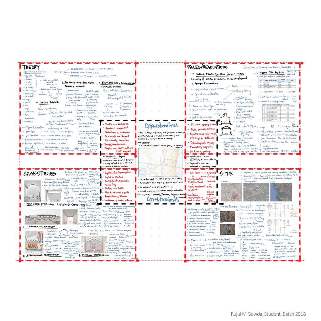This graphic maps out the foundational layers of this architectural thesis. It is divided into four main sections: Theory, Rules/Regulations, Case Studies, and Site, each framed within a red-dashed grid. The Theory section examines the conceptual underpinnings of topics such as death, memory, architecture, and cultural practices. Rules and regulations outline statutory guidelines, policies, and planning frameworks that shape the design context. Case Studies analyze precedents of crematoriums and memorial architecture, highlighting spatial, cultural, and functional insights. The Site section documents location, demographics, and urban context, supported by maps and diagrams. At the center, the synthesis of these layers is distilled into Opportunities and Constraints, forming the core design direction. This structured approach demonstrates a comprehensive, research-driven method of thesis development, balancing conceptual, regulatory, contextual, and practical dimensions.