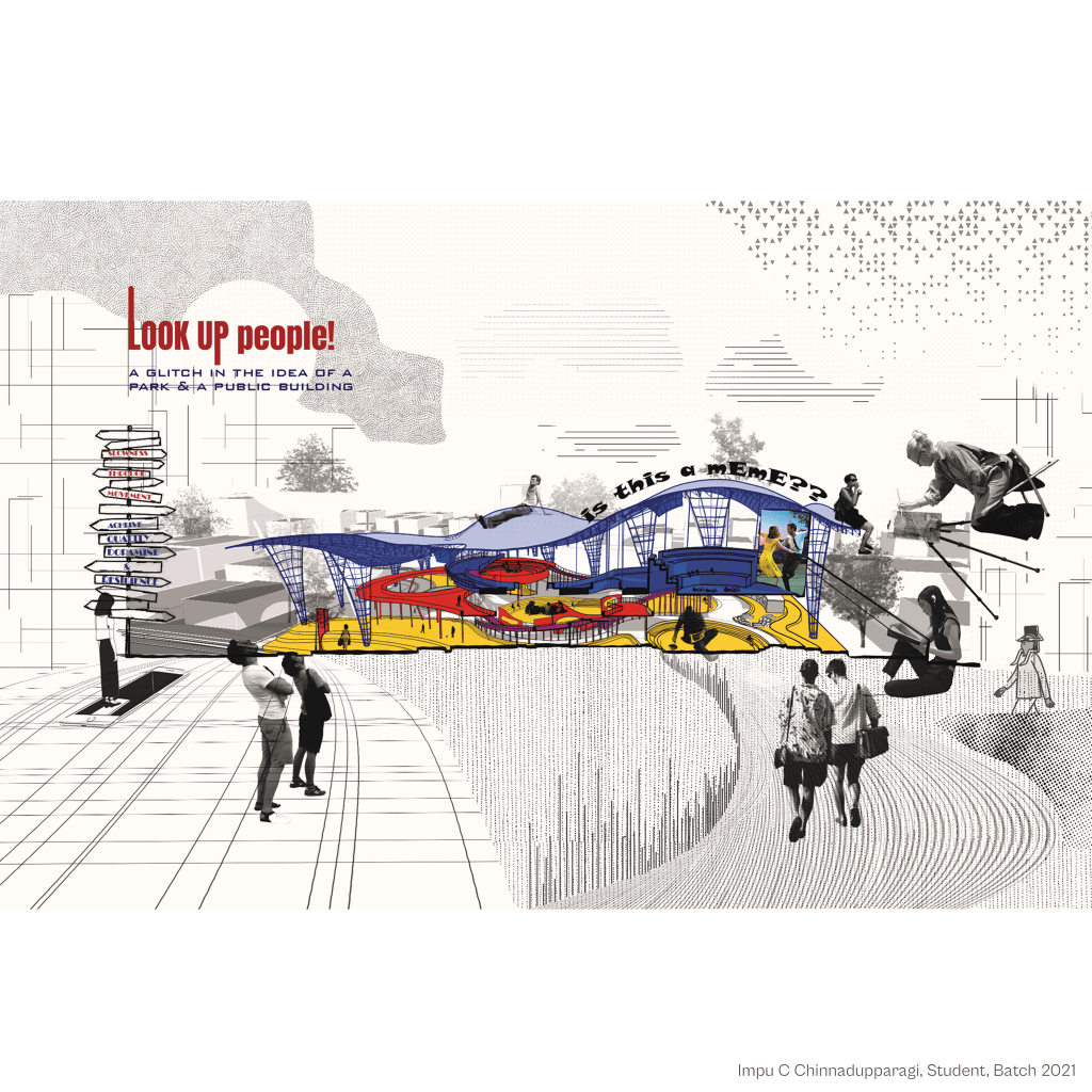 “Look up People: exploration of an offline space in an online world” , was created using a mixed-media digital workflow combining SketchUp, Adobe Photoshop, and Adobe Fresco. The base of the composition is a sectional perspective exported from SketchUp, which provided the volumetric clarity and spatial organisation of the architectural proposal. Over this, multiple layers of hand-drawn elements were added using Adobe Fresco to introduce a more intuitive, expressive quality. Textures, collage figures, and graphic patterns were layered in Photoshop, allowing precise control over contrast, colour, and depth.