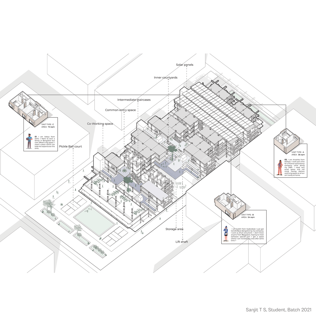 The graphic was first completed in SketchUp by having different elements of the building tagged in different tags which helps to export better when required for making different kind of drawings. Next after exporting it as a PDF and its shadows as PNG, I proceeded in Adobe Illustrator where I cleaned the unnecessary lines in the drawings. Once cleaned I took it to Photoshop to add the colours, shadow, humans and vegetation.