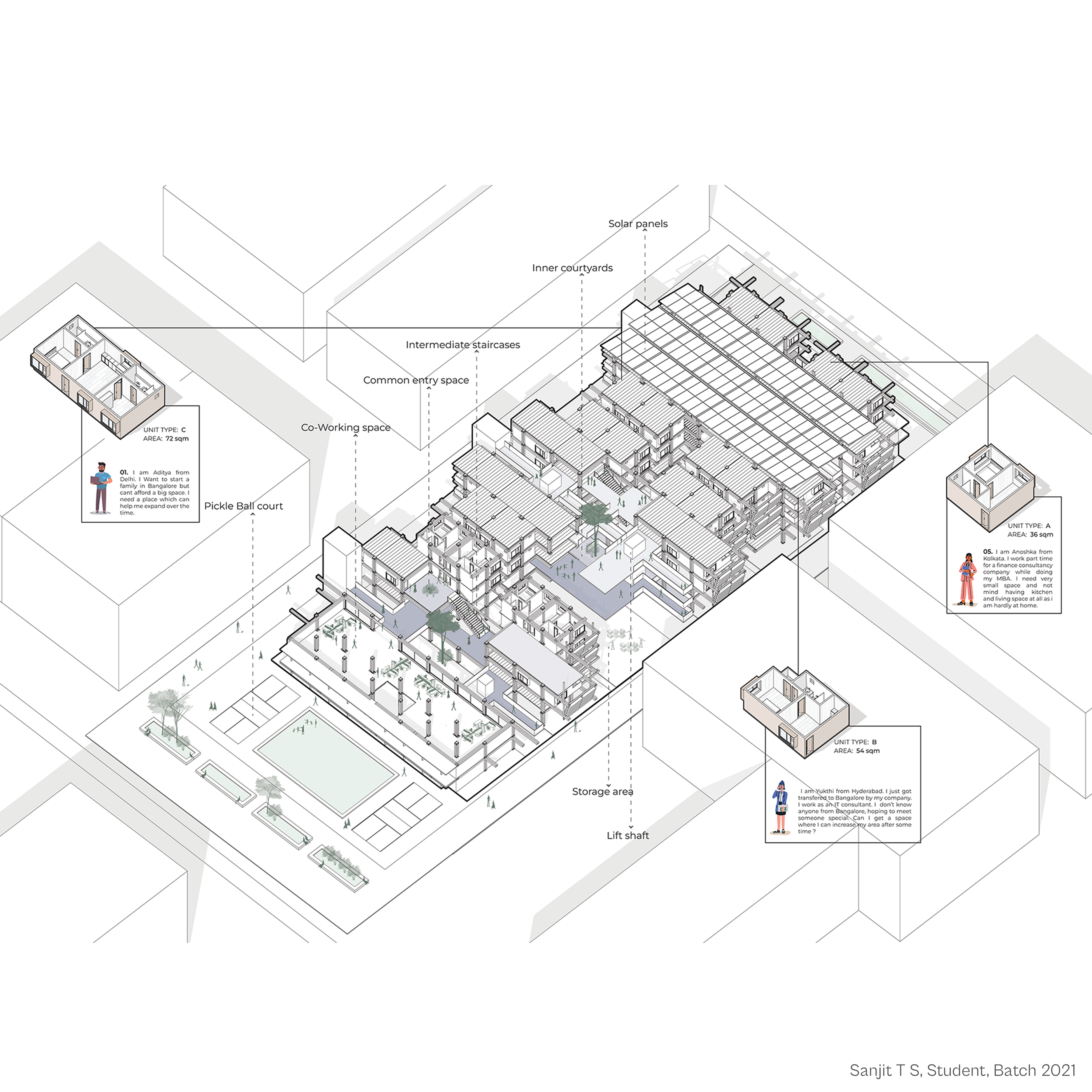 This illustration was created to depict the organic growing of the housing which I had named as Housing as a Living System. The illustration shows exposed structural elements, unfinished parts of building as a symbol that the building keeps taking different shapes.