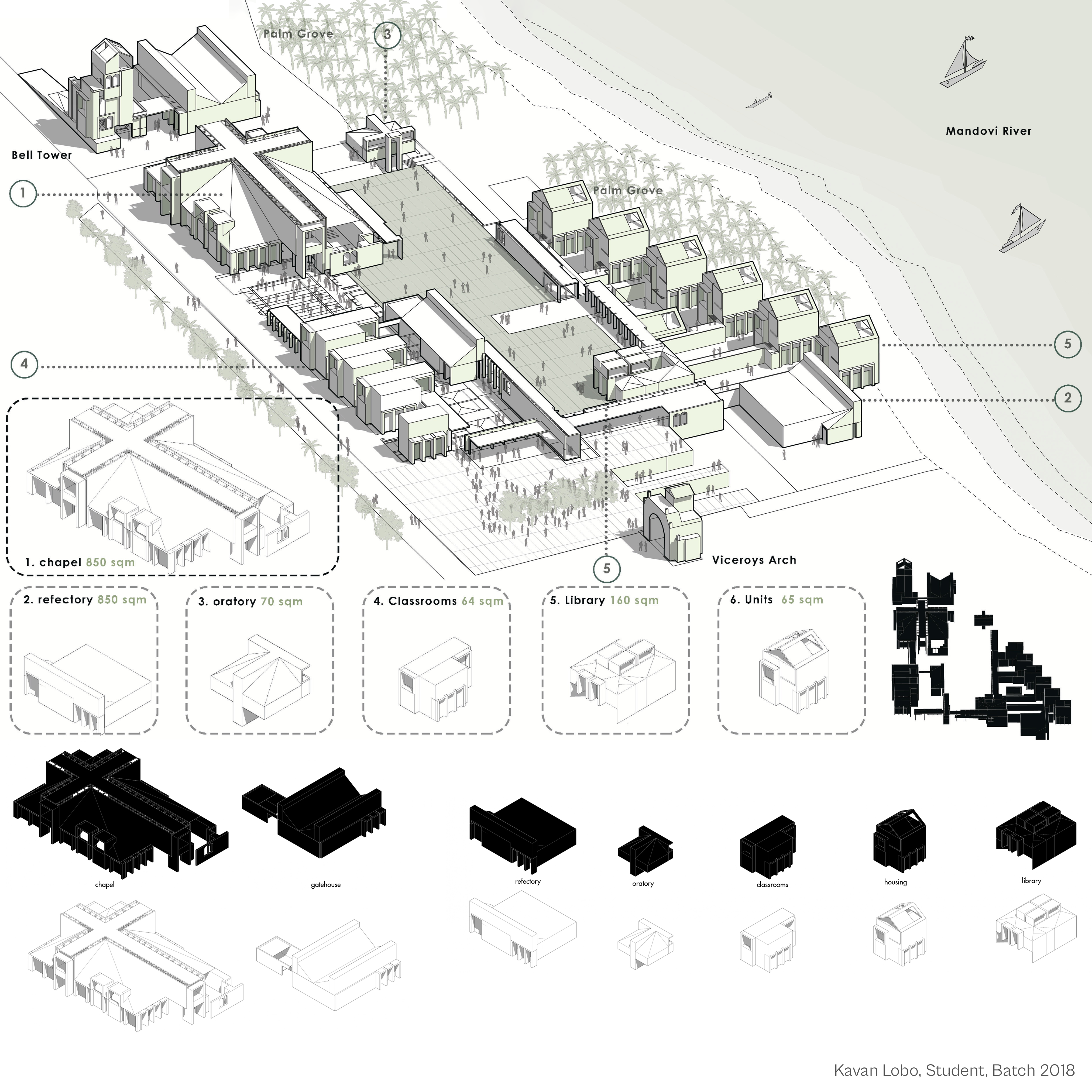 All drawings were initially generated in SketchUp and subsequently exported to CAD for line-weight control and refinement. The primary isometric projection was further developed in Adobe Illustrator and rendered with the assistance of Anish Bhargav (Batch of 2019).